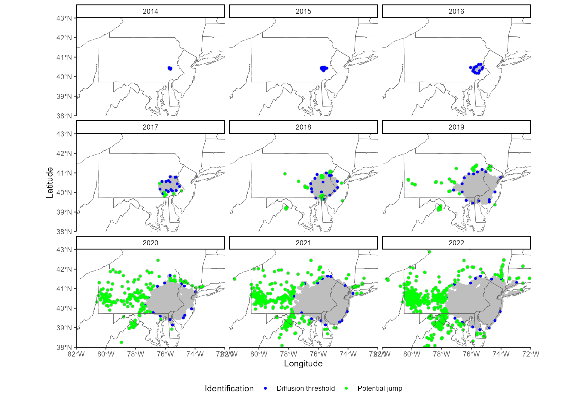 Some jumps were clustered in the same area. Jump clusters may stem from independent dispersal jumps, i.e. SLF hitchhiked multiple times to these locations the same year. Alternatively, jump clusters may result from SLF quickly spreading around a single dispersal jump. Finally, they can be a mix between these two hypotheses. We identify these jump clusters to better understand jump locations.
